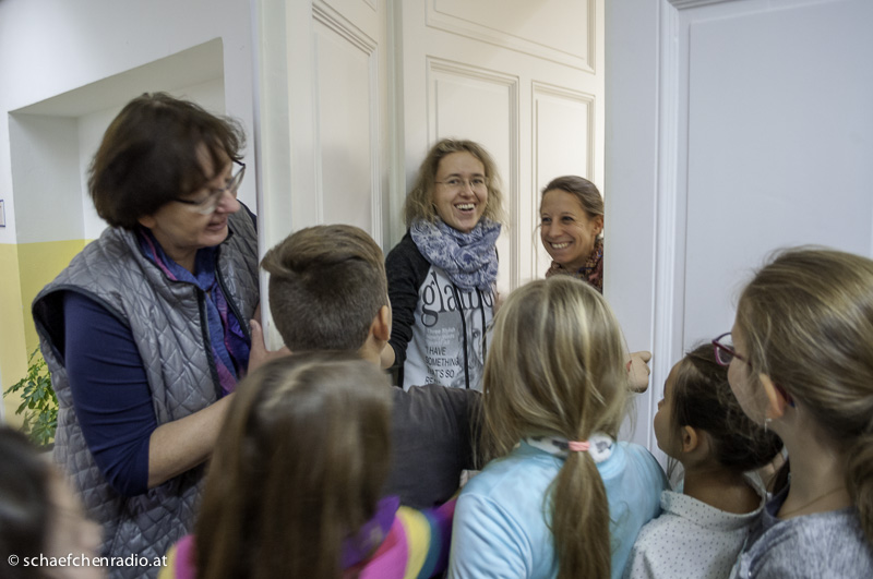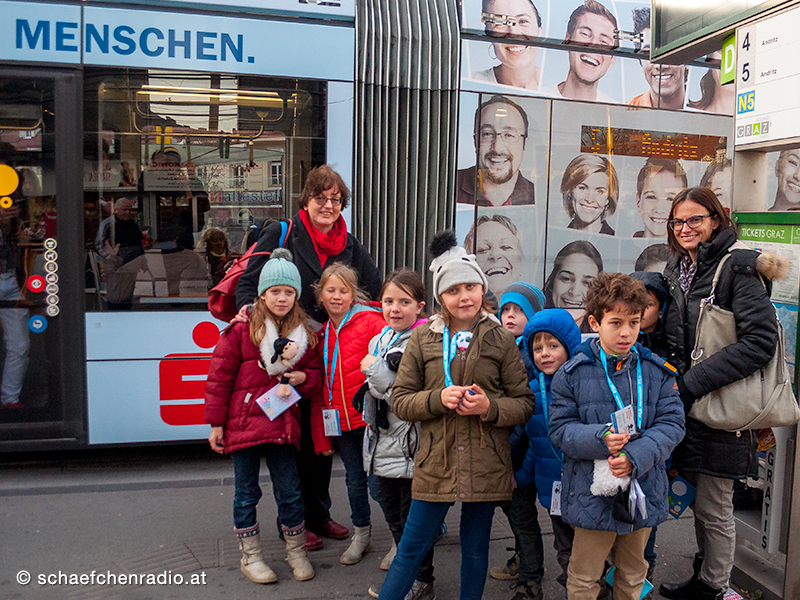 Die SchäfchenreporterInnen sind auf ihrem Stadtausflug nicht nur in Begleitung ihrer Religionslehrerin und Schäfchenmeldeamtsleiterin Gerlinde Praher und ihrer Direktorin Elke Reisinger, sondern auch mit Doris Rudlof-Garreis und Didier Hampl unterwegs.